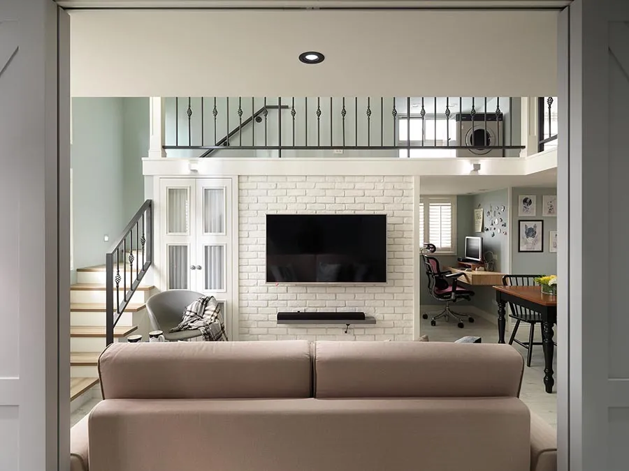 从角落移到明亮窗边的楼梯,除了利用梯间及电视墙的深度,